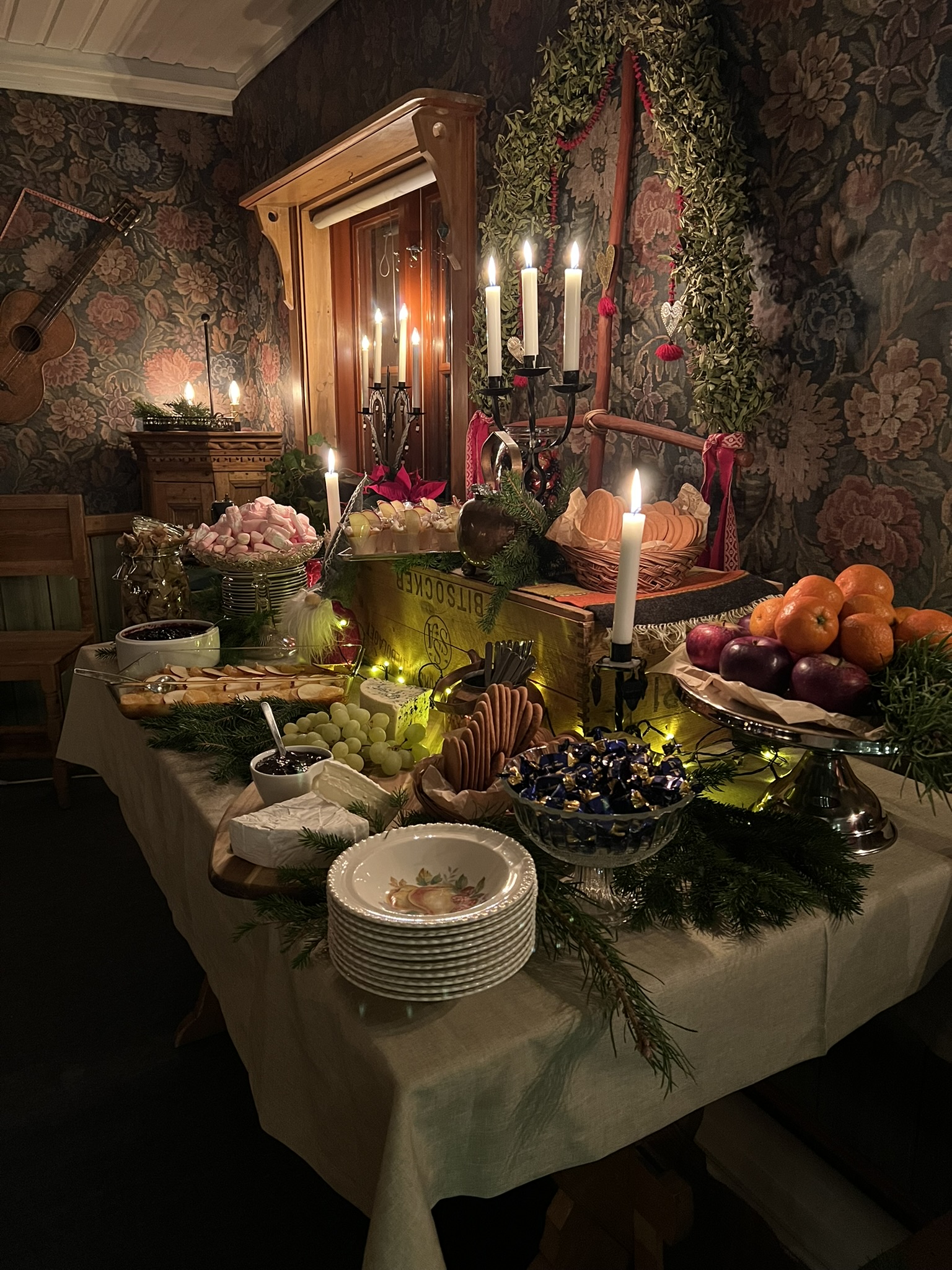 Julmat på fäboden i fyra delar. Vi börjar med en planka med utvalda sillar, ägg och lax. Efter det kommer plankan med kallskurna lokala charkuterier som skinka, korv och ost. Vad sägs om varmt i stil med omelett, köttbullar, korv och Jansson, serverat på …planka. ALlt såklart serverat med goda tillbehör. När du tror att du inte orkar mer är det dags att hugga in på dessertbordet. Låt er väl smaka!